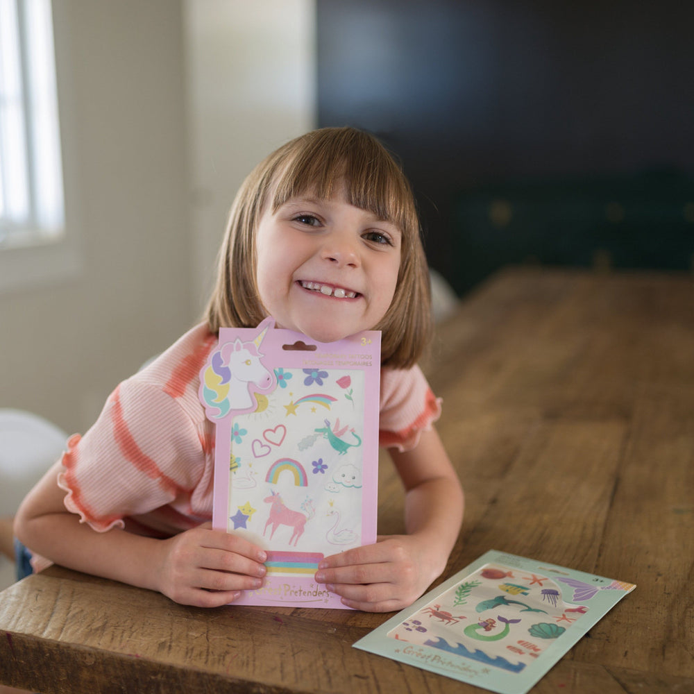 This set of temporary tattoos includes rainbows, unicorns and all the magical creatures made with a glitter finish to reflect beautifully in the sun! Our temporary tattoos can be applied like a classic temporary tattoo. Instructions are included on the back.