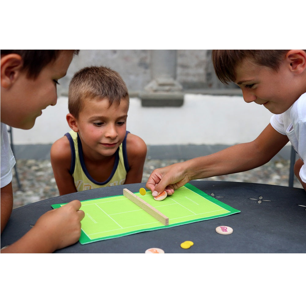 TENNIS has been turned into a wooden board game, using the principles of tiddlywinks. Using the edge of the larger disc, lightly push down on the edge of the smaller disc so it “jumps” forward. The player whose shot it is has to shoot the ball disc over the net and your opponent has to try to return it. The game continues like this until one of the players hits a winning shot, which is when the disc lands in your opponent’s half but then bounces away, making it impossible to return. The player who hits the most winners is the winner. The game has singles and doubles versions!