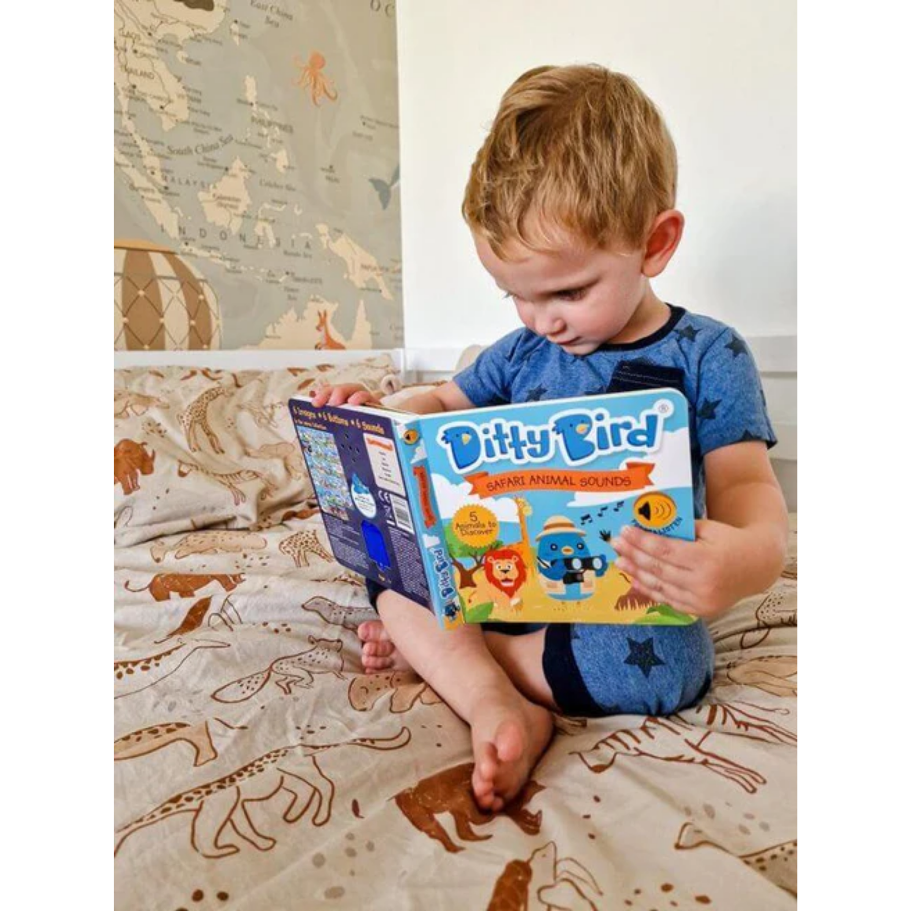 Let’s go on a jungle safari with Ditty Bird and his friends to discover the sounds and songs of African animals. A gentle touch of the ‘sound dot’ on each page will trigger real life sounds of five favorite animals along with a song in Lingala!
