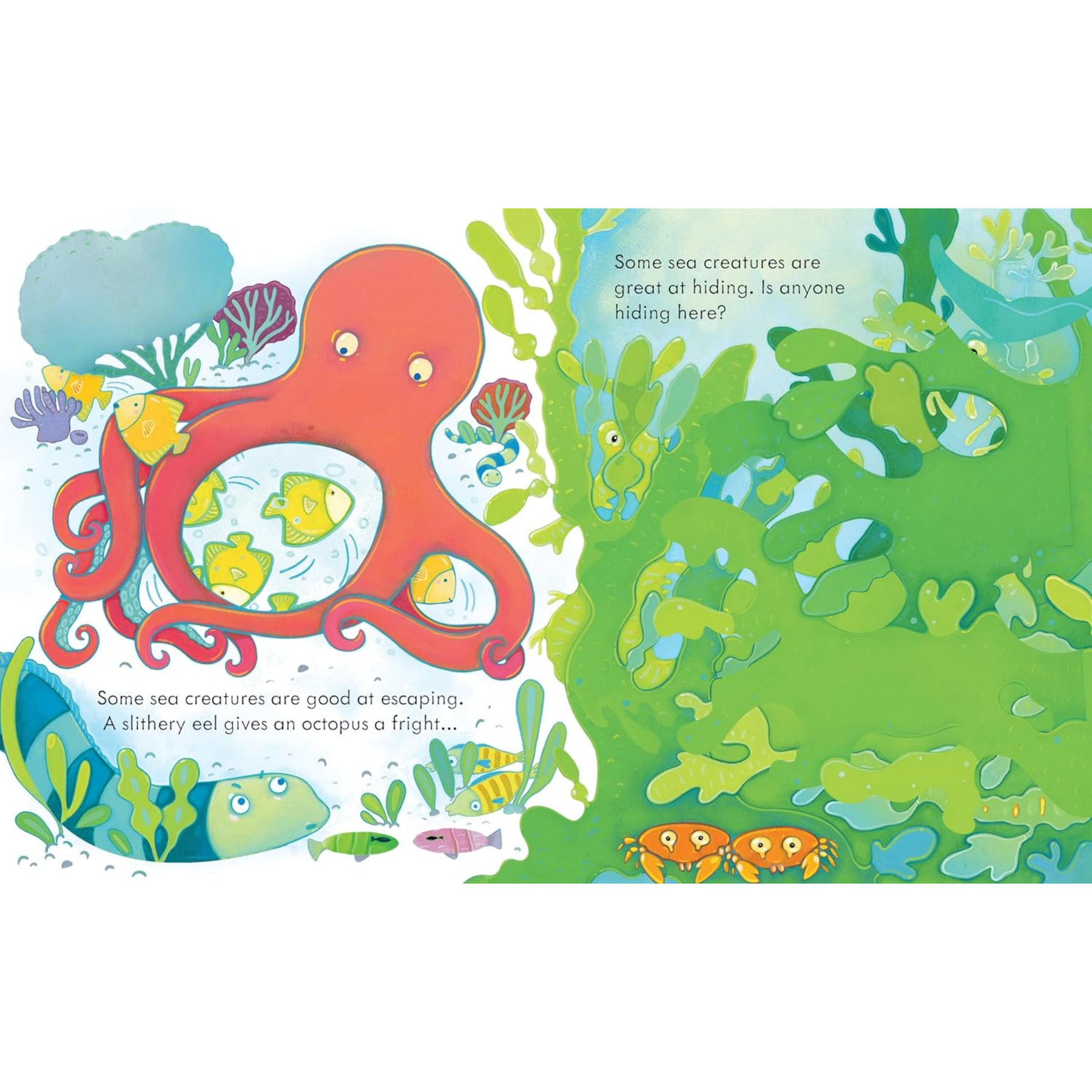 Peep under waves and behind coral to discover hungry sharks, shy sea dragons and lots more hiding behind the flaps in this wonderful first book about the sea. Little children will love poring over the beautifully illustrated scenes, which include a submarine exploring the deep sea, waves lapping onto the shore and a sunken ship.