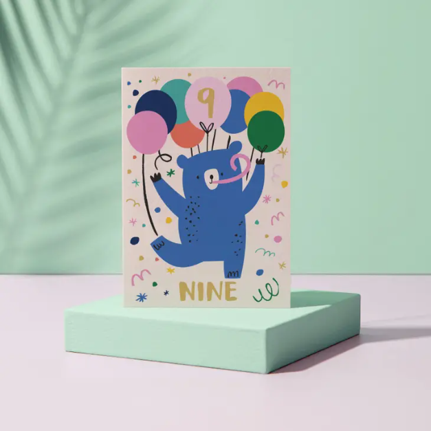 Bear Themed Nine Year Old Birthday Card - Designed for our Artist Series by Ashley Le Quere. A6 Gold Foiled Greeting Card, blank inside, printed on Tintoretto Gesso which is a textured board, paired with a brown recycled envelope. Each card is packed with a cello bag, on request we also offer card clasps as an eco option. Each card is printed on 300 gsm, FSC-certified paper from sustainable sources. The size of the card is A6, which is 105 x 148 mm or 4.1 x 5.8 inches. Blank inside allowing you to write your own message. This Children's card is part of our Artist Series collection. The design features beautifully illustrated Bear in a playful way, finished with gold foil. This design is part of numbers 1-10 of illustrated animals.