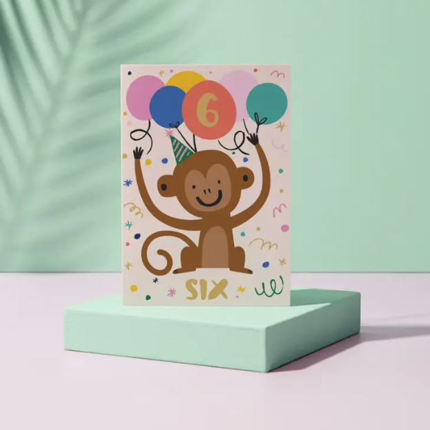 Monkey Themed Six Year Old Birthday Card - Designed for our Artist Series by Ashley Le Quere. A6 Gold Foiled Greeting Card, blank inside, printed on Tintoretto Gesso which is a textured board, paired with a brown recycled envelope. Each card is packed with a cello bag, on request we also offer card clasps as an eco option. Each card is printed on 300 gsm, FSC-certified paper from sustainable sources. The size of the card is A6, which is 105 x 148 mm or 4.1 x 5.8 inches. Blank inside allowing you to write your own message. This Children's card is part of our Artist Series collection. The design features beautifully illustrated Monkey in a playful way, finished with gold foil. This design is part of numbers 1-10 of illustrated animals.