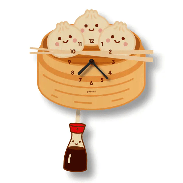 Experience a deliciously cute addition to your home with our dumplings pendulum clock. Featuring a kawaii design of 3 smiling dumplings and a swinging soy sauce bottle pendulum, this clock adds a touch of whimsy to any room. Keep track of time while adding a charming touch to your decor.