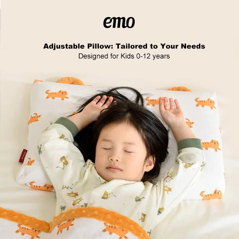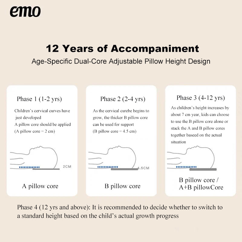 The Emo Sleep Kid's Pillow is expertly crafted for children aged 0-12 years, featuring an adjustable height to meet individual comfort needs. This age-specific pillow incorporates a dual-core design, allowing for personalized support as your child grows.