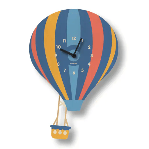 Enhance your child's room with our whimsical wooden hot air balloon pendulum clock. This high-flying clock features a colorful design and a swinging basket pendulum, adding a touch of imagination to any space. Perfect for teaching time and adding a playful touch to your home decor.