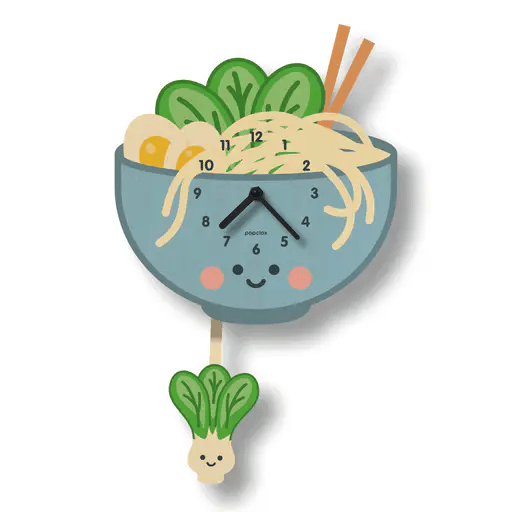This adorable ramen pendulum clock features a smiling bok choy pendulum and tasty noodles in a fun and delicious bowl. A delightful kawaii treat for any ramen lover or anyone looking to add a playful touch to their decor.