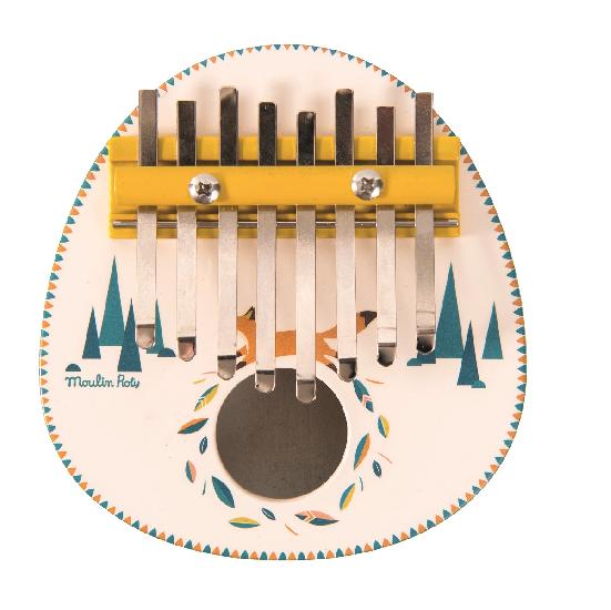 Kalimba with painted wooden base and metal slats, with folk and poetic illustrations representing the little fox of the range surrounded by pines and feathers. Develops the rhythm, motor skills and musical awareness of toddlers. Dimensions: 13 X 14 cm