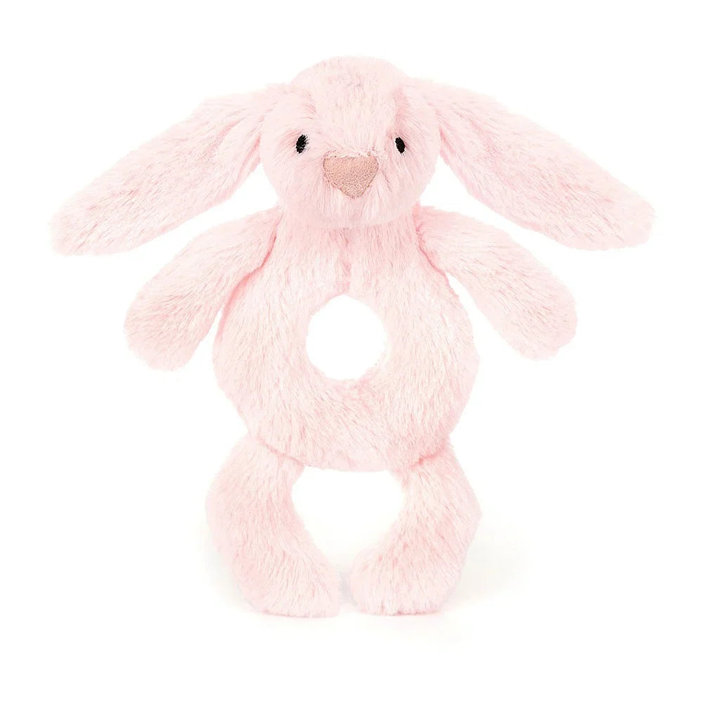 A treat for tiny hands, Bashful Silver Bunny Ring Rattle can be grabbed by its soft paws, long lop ears or ring-shaped tummy. When given a gentle shake it will sound the rattle inside, much to baby’s delight! Crafted in a silver-grey coloured fur made from recycled fibres featuring a Bashful Bunny pink suedette nose and embroidery eyes.