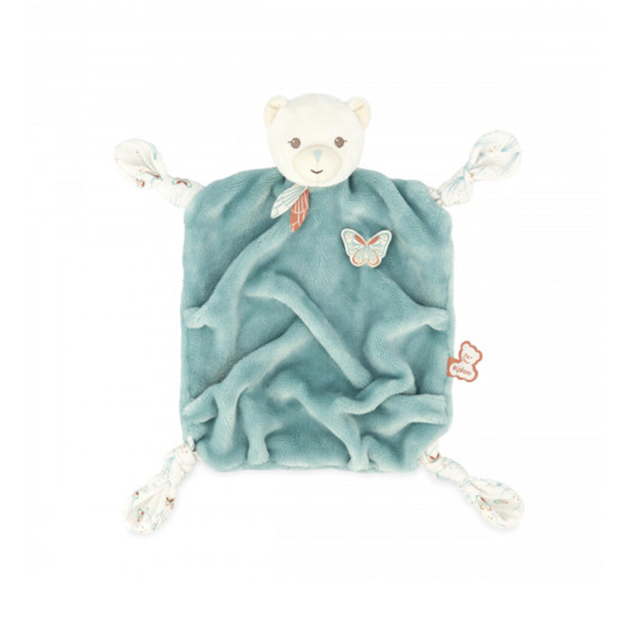 Doudou bear comes in a new green colour and a new incredibly soft and fluffy material. Its little face and friendly smile make it an ideal companion for your child. The feathers and butterfly delicately placed on its heart give it a touch of poetry and lightness. The doudou includes 4 knots that are ideal for yo ur baby to freely play with or to chew on. You can also hook your little one's dummy to one of the knots to keep it close. Presented in an attractive gift box that can be customised with a message in the space available under the lid. Suitable for newborns and upwards. Machine washable.