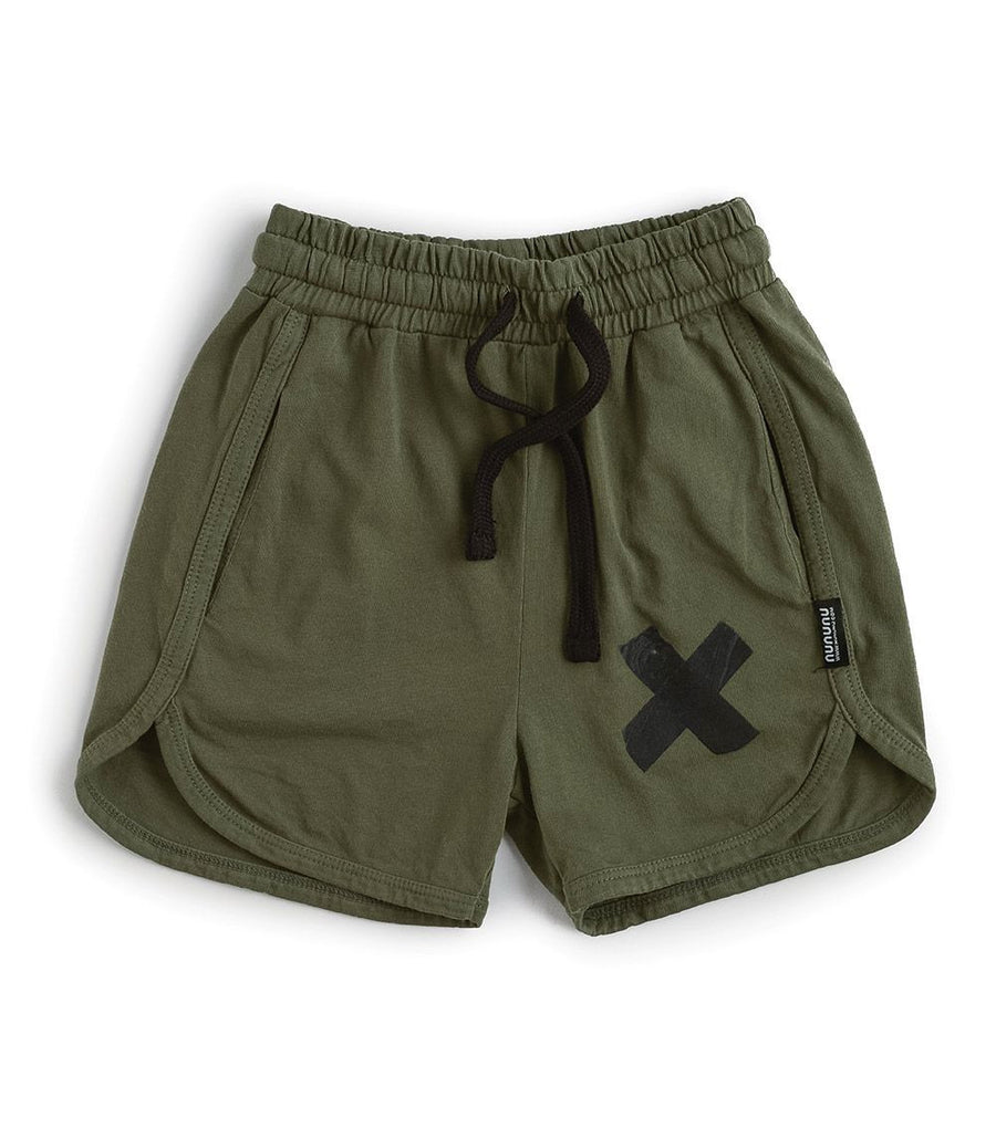 summer style is all about shorts & these olive babies are the bomb basic for boys & girls. super light, soft jersey cotton is the way to do it in this gym-style loose cut with the rounded hem & tonal piped edges. the drawstring waist keeps it tight (literally), and there’s an x on one leg, for the win.
