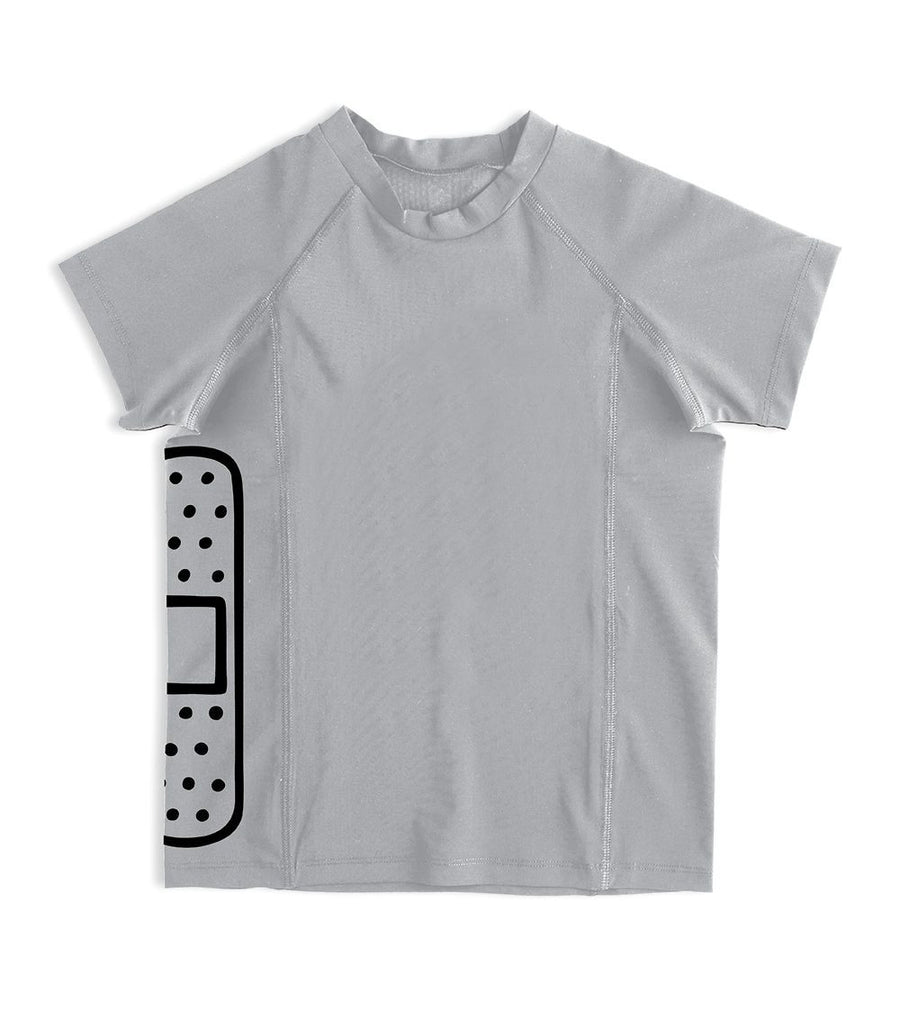 this short sleeved unisex rashguard comes in our dopest new color, ice grey. literally cool, it has the iconic bandaid design from our favorite urban artist dede. this image has appeared all over the world, graffiti-style, in the unlikeliest of places. now, we’re bringing it to the kids as part of our “nununu for the arts” collection for ‘22. apart from the dopeness of the design, our rashguards are great for sun protection & paddling out on the boogie board. pairs with any shorts or swimsuit for high-style beach looks.