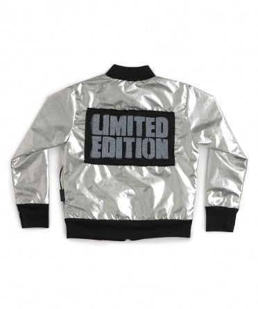 not for the fashion faint of heart, this nylon silver bomber jacket is a straight stunner for boys & girls. bling out the whole neighborhood in this ode to glam rock and ‘80s streetwear. on the back, we have our “limited edition” patch in grey & black, which lets them all know they’re dealing with something super rare & cool for the holiday season. the cuffs have thumbholes for that fingerless glove effect. this piece styles amazingly well with tees & jeans or even dresses all year round.