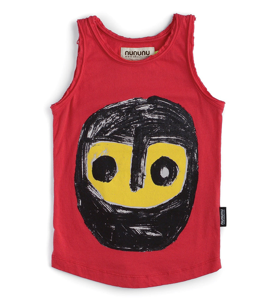 the warrior. this very nununu design -a collaboration with artist shay id alony– is a fun take on the global culture of face-covering that defines our times. we’ve always been fans of the eyes-only look anyway (see our ninja shirts) and this scribbly guy lets the boys & girls lean into it while expressing a strange sense of human unity. he comes nice & big on the front of this awesome red tank with raw, rolled edges.