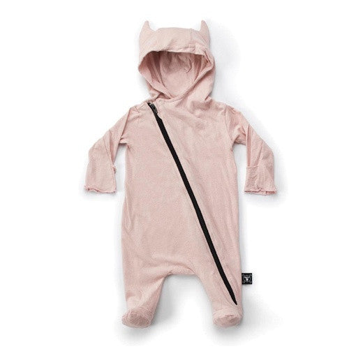 we think of babies as born explorers, learning the lay of the land for the first time. give your kid that badass viking look with this head-to-toe powder pink footed overall with a horned hood. the signature nununu diagonal zip not only looks dope, it also makes for easy on & off, which is key when you’re battling an intrepid soul. we left the sleeves raw at the edges, for extra badassery.