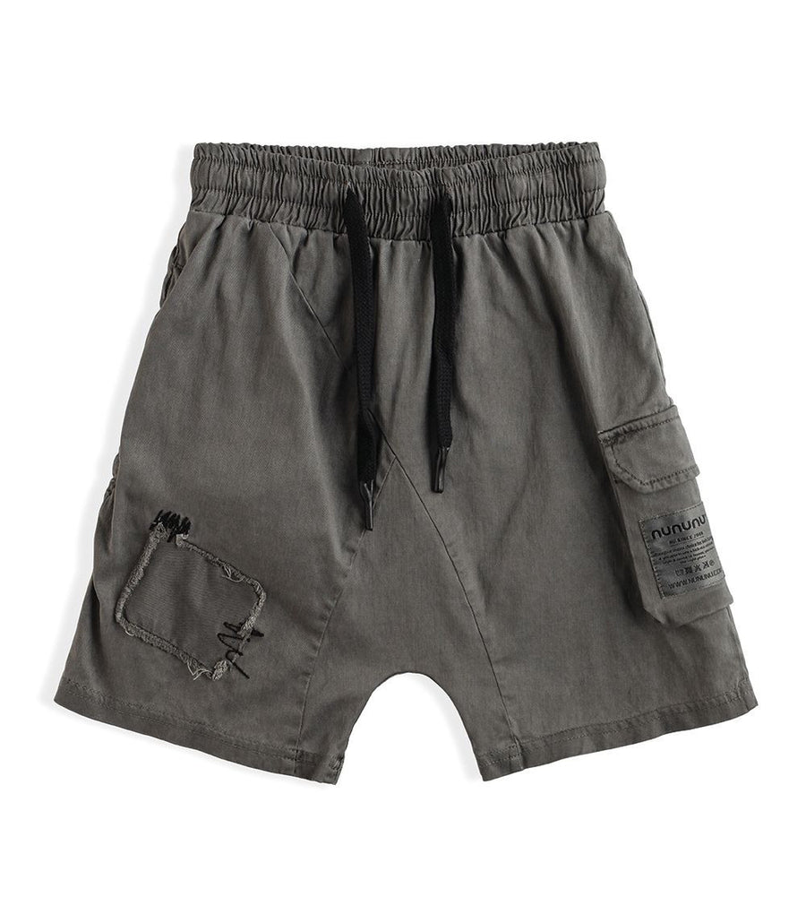 say what you want about cargo shorts. we are ride or die, forever. the reason is, we just keep coming up with new ways to stunt on this dope staple. here, we’ve reimagined cargo shorts in a flexible vintage grey canvas material for boys & girls, so they’re soft & slouchy with strategically placed “repair” patches. a flap pocket on the side is always a good place to hide some secret only they know about. an elastic drawstring waist keeps them criminally comfy & the care tag is sewn cleverly on the outside, because we don’t do things like everyone else.