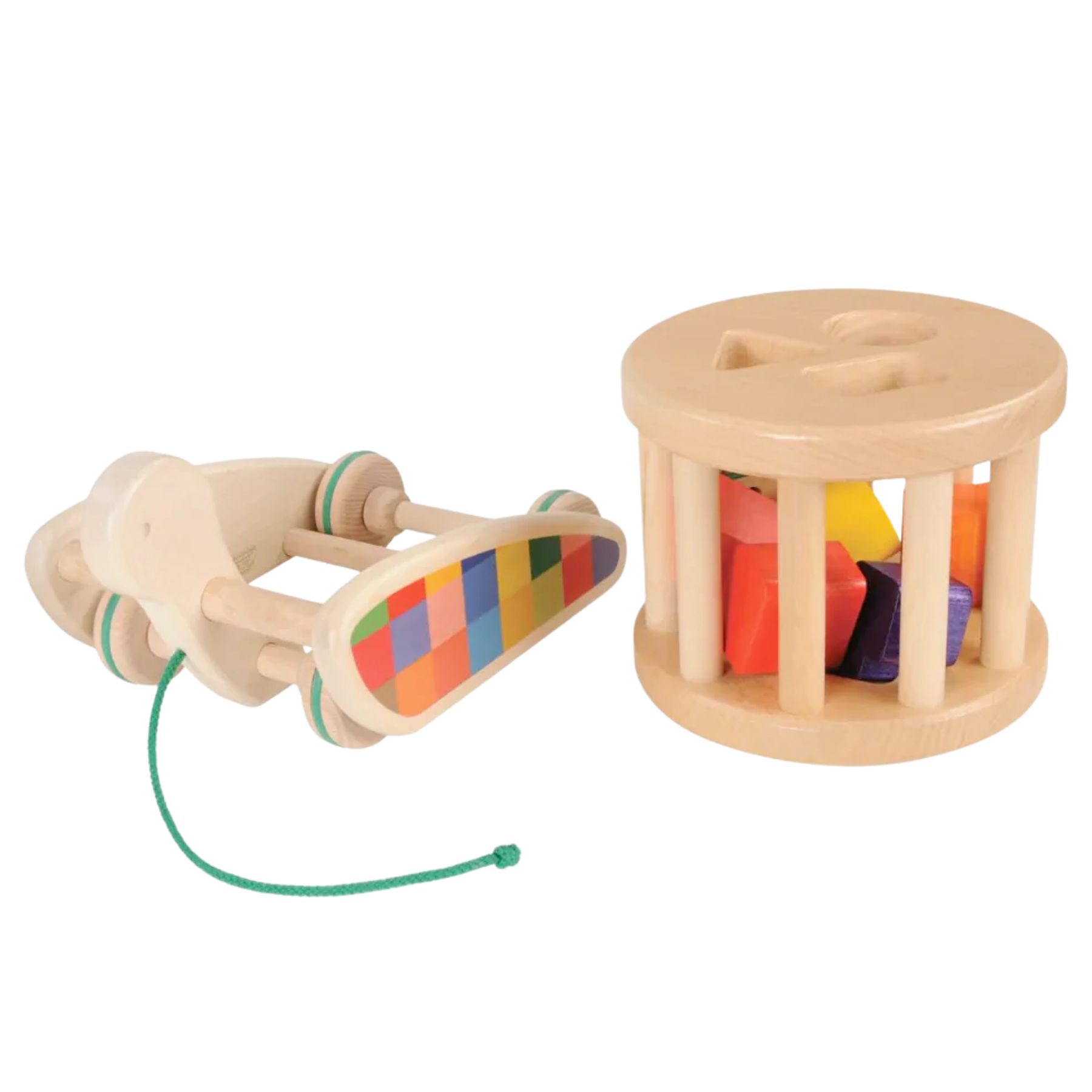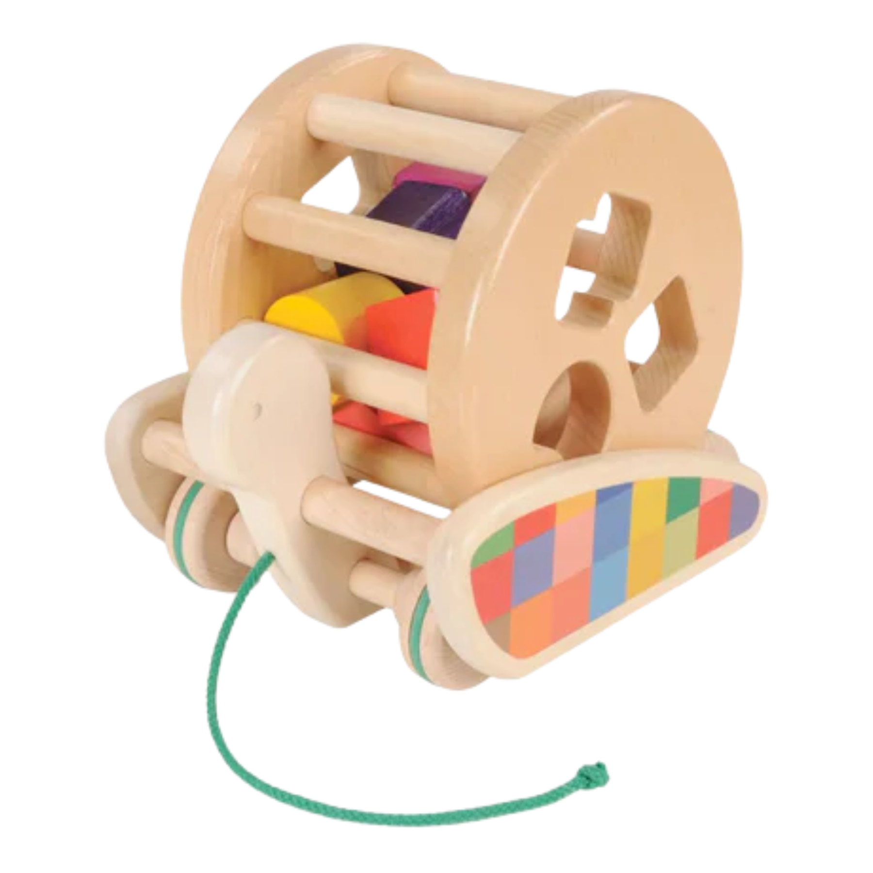 The Snail Shape Sorter on a String with Blocks is a unique wooden toy that combines the function of a shape sorter with a pull-along toy. This colorful snail with a movable shell filled with differently shaped blocks encourages little ones to match the pieces while enjoying active play. With its thoughtful design, children can pull the snail along or explore the world of shapes and colors by placing the blocks into the corresponding holes.