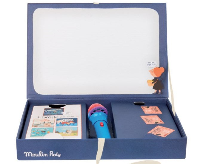 Tell your evening stories in an original way, thanks to this home theater! This box contains a stack of programs, movie tickets, a story flashlight and 5 disks each containing 8 slides that tell a story. The images can be projected on the screen of the box or directly on a wall.