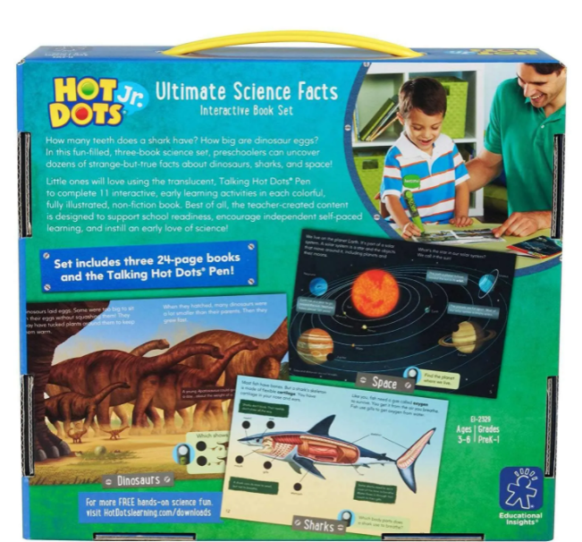 Uncover some truly fascinating scientific facts and encourage an early interest in science with three fully-illustrated, interactive, non-fiction books-Dinosaurs, Sharks, and Space. Also includes the Hot Dots(R) Talking Pen with a cool, translucent look!