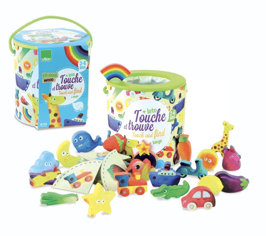 Wooden feel and find game by VILAC includes 41 wooden pieces. approx Dimensions of barrel: 16 x 16 x 16 cm. NOTE: Safety rated for ages 2 to 6 years old.