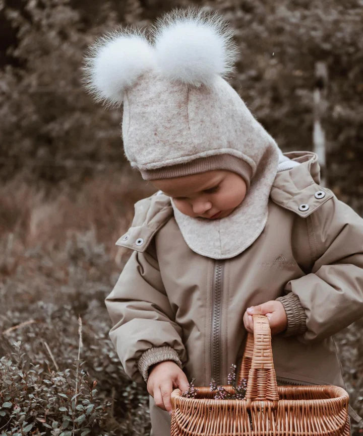 Lovely and warm Huttelihut Balaclava in two layers, with soft alpaca fur pom-poms on top. The Huttelihut Hat has a round head shape and a wide elastic rib edge at the face opening, ensuring a good fit. The balaclava features a practical split design with extra length in the neck. Made of a nice Merino wool blend, it is lined with soft velour on the inside. The pompom is a Fairtrade product, made with fur from alpacas in Bolivian highlands. Every pompom is unique and will vary in color and expression. No coloring is involved - except nature's own. The pompom is sewn by hand and can be washed. See instructions in the care label. Color: Sand Off White