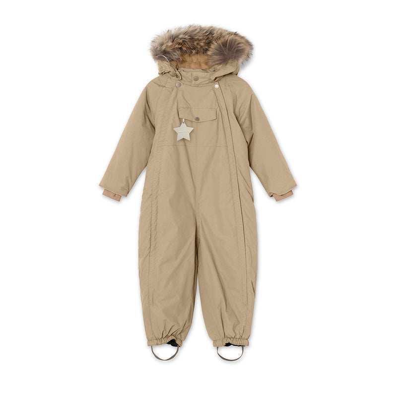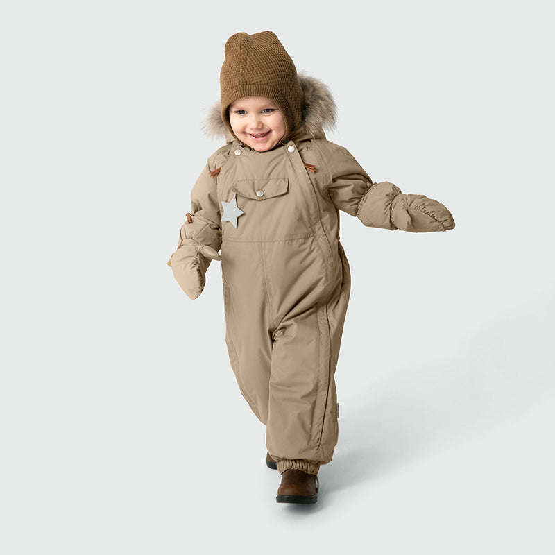 Iconic MINI A TURE snowsuit with 10-year guarantee. Wind- and waterproof, breathable, and tested to keep warm down to -25 degrees Celsius. Opens at the front by two hidden, slanted zippers. The hood is detachable and the real fur can be removed using a hidden zipper. The waist can be adjusted from the inside, where the jacket also has a soft fleece lining. Snow cuffs at the wrist with thump opening and adjustable waist from the inside. Sizes up to and including size 86 cm (18m) have a rib around the neck, while the larger sizes have a regular collar.