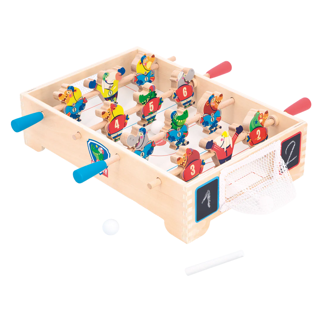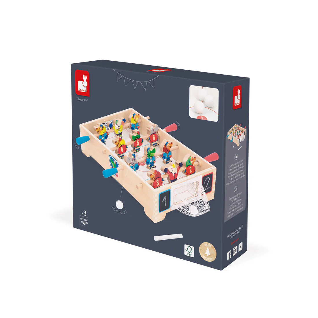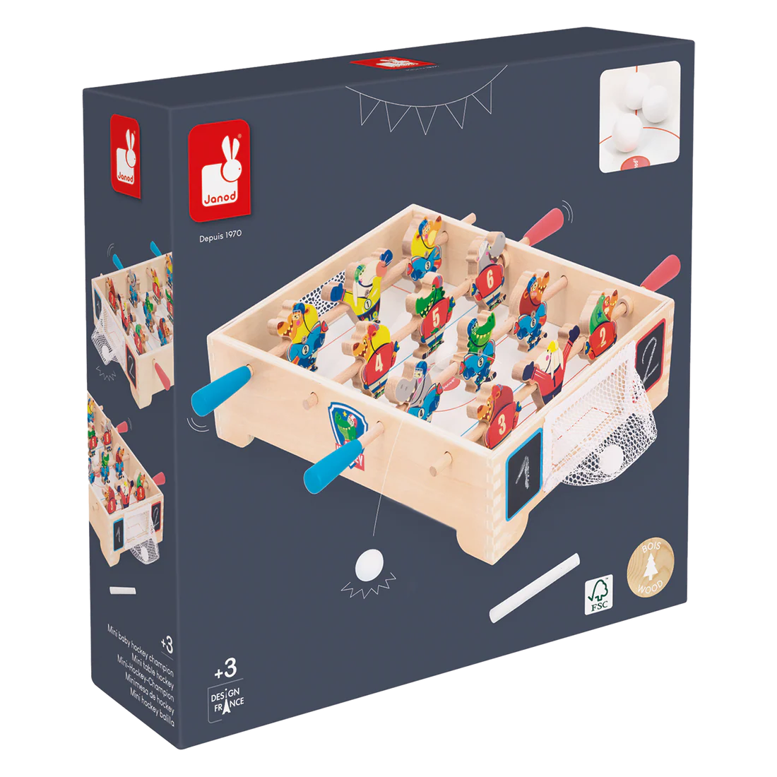 The Janod Mini Baby-Hockey Champion Applepop is a wooden skill game designed for children aged 3 years and up. Inspired by ice hockey, this miniature foosball allows players to compete by using two sticks to send a ball into the opposing goal. The game includes 12 stylish characters spread across 4 rods, each equipped with sticks, skates, helmets, and elbow pads. The goals are removable via a Velcro system, and the set comes with 3 balls and 2 chalks to keep score. Made from FSC®-certified wood, it measures 32.5 x 31 x 10 cm. This game promotes the development of fine motor skills, hand-eye coordination, and team spirit. Ideal for retailers specializing in educational toys.