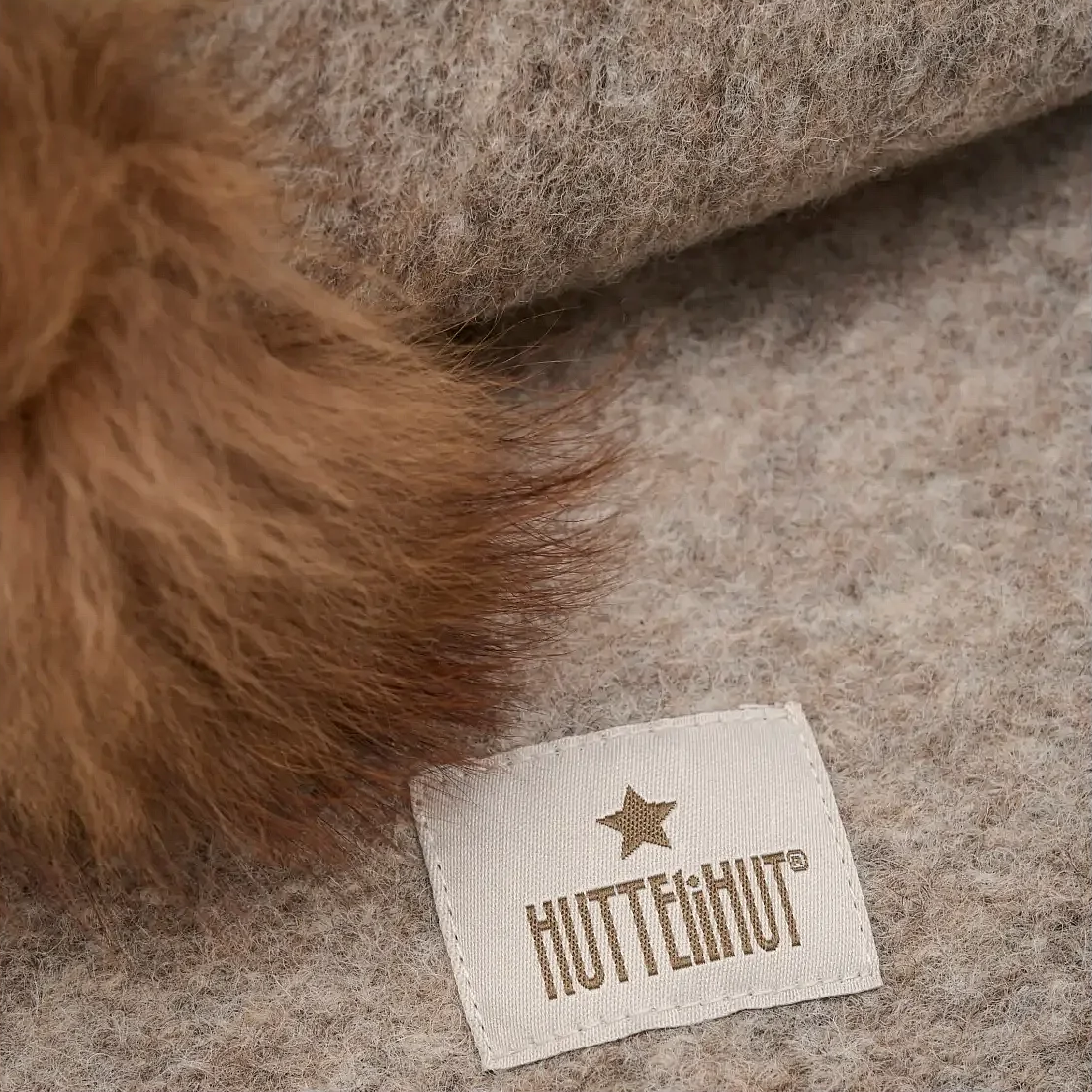 Lovely and warm Huttelihut Balaclava in two layers, with soft alpaca fur pom-poms on top. The Huttelihut Hat has a round head shape and a wide elastic rib edge at the face opening, ensuring a good fit. The balaclava features a practical split design with extra length in the neck. Made of a nice Merino wool blend, it is lined with soft velour on the inside. The pompom is a Fairtrade product, made with fur from alpacas in Bolivian highlands. Every pompom is unique and will vary in color and expression. No coloring is involved - except nature's own. The pompom is sewn by hand and can be washed. See instructions in the care label.