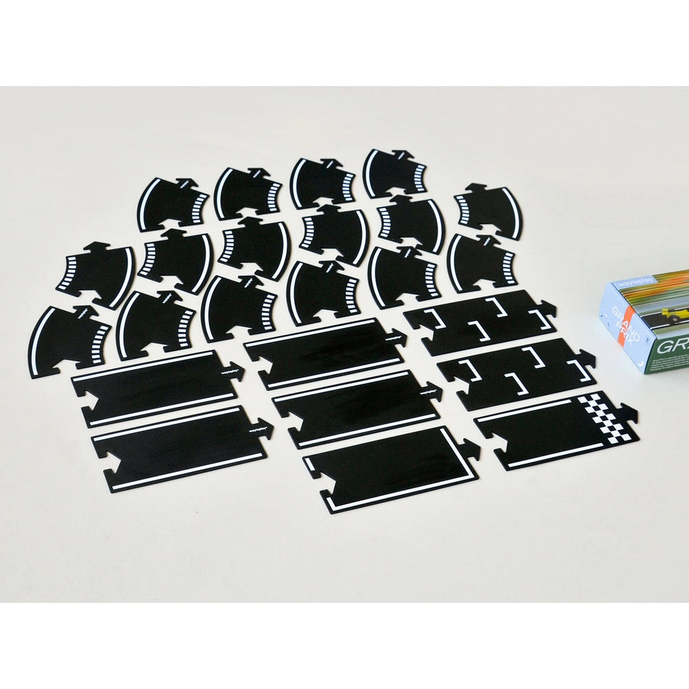 Kids just love car racing adventures. With their last gasp winners, cool underdogs and dastardly villains. The new Grand Prix set by waytoplay brings that excitement into your home. Countdown starts, amazing pit stops and daring takeovers. 24 specially printed road segments offer maximum racing fun - fully compatible with existing waytoplay sets. Waytoplay Grand Prix encourages imaginative play. Let your children create their own circuits and racing stories. Using their favourite toys to have endless high speed fun. Circuit length 384 cm. 16 curves and 8 straights, printed on both sides. Special ‘Grand Prix’ printing on the curves, including curbstones. Special ‘Grand Prix’ printing on the straights featuring start grid, finish line and pit lane. Easy to connect parts