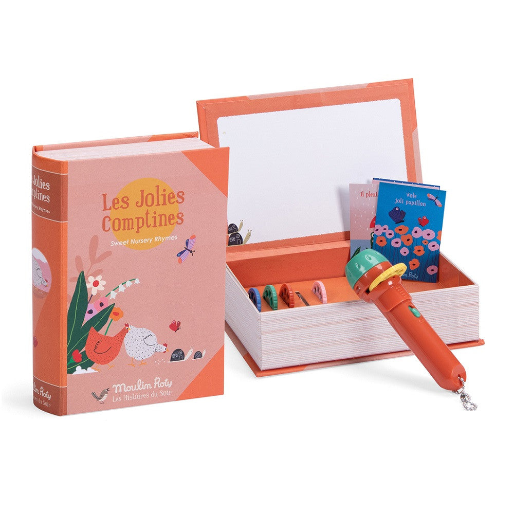 Beautifully illustrated gift box with projection screen! Designed like a book, contains one flashlight, 5 nursery rhyme-themed disks and 5 cards for singing along. Develops young children's imagination and creates opportunities for quality time together. Storybook Torch measures approx 12 x 16.5 cm. Safety rated for ages 4+.