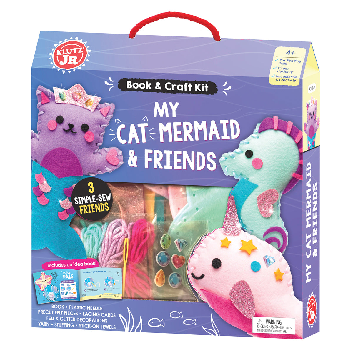 Build fine motor skills and learn to sew with a cat-tastic mermaid and her sweet sea critter friends. Start with simple lacing cards featuring a seashell and sea star, before you dive into the three felt projects: seahorse, narwhal, and a cute cat mermaid. Get creative by decorating your undersea friends with felt stickersand glittery embellishments. (Because every mermaid needs a crown!)
