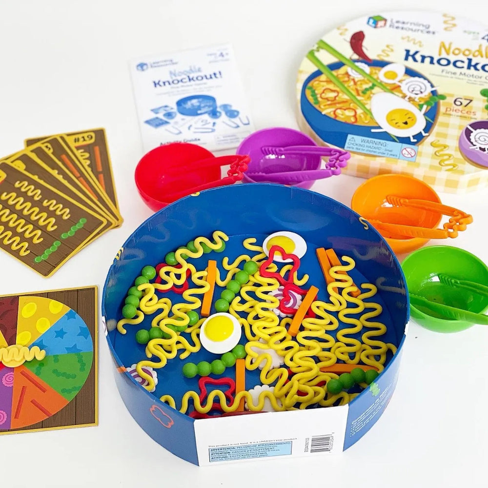 A fine motor game inspired by the world’s most slurpable soup! Grab the chopstick-style tongs, spin the spinner, and test your fine motor skills as you sort stretchy noodles and colorful veggies. Each game builds 3 skills in 1 – strengthen your fine motor, counting, and sorting abilities! Includes guide with multiple gameplay options. Zero-waste box serves as both a game board and easy storage! Big noodle measures 5”L x 0.75”W x 0.25”H; bowls measure 3” in diameter x 1.5”H.
