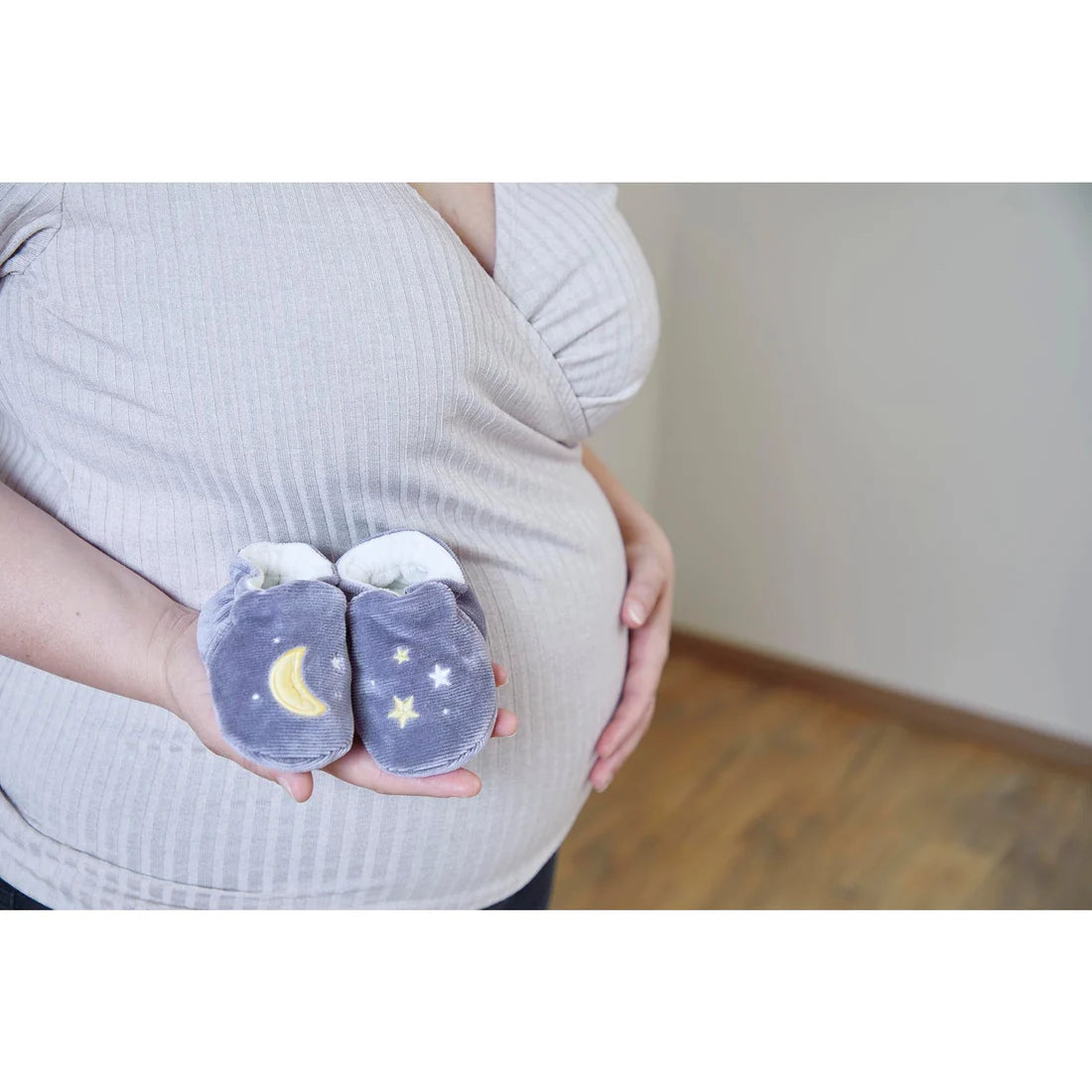 To gently stimulate baby's hearing from birth, you get: a micro-velvet bracelet (size 3-9 months) with an adorable plush elephant face and integrated bell, and a pair of corduroy booties decorated with nursery rhyme embroidery (12x4 cm).