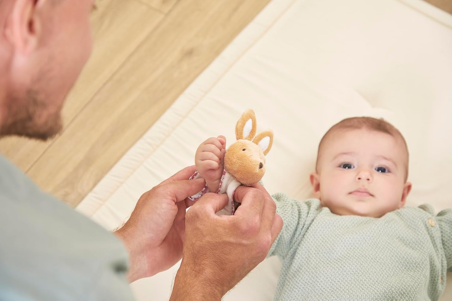 One of the two slippers also incorporates a bell, to deliberately encourage baby's motor skills and enable him to strengthen his proprioception and discover the concept of cause and effect. By wearing the bunny bracelet and slippers, and wiggling his feet and hands, baby produces sounds and learns to be curious, all accompanied by his parent.