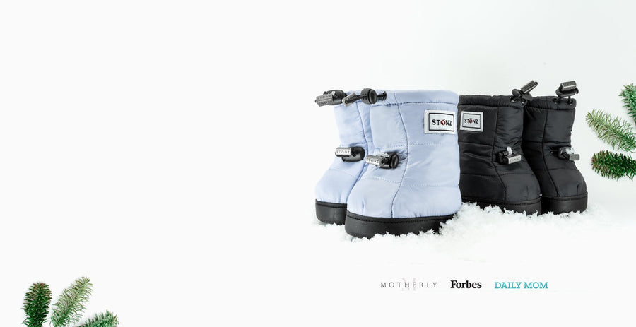 An ingenious children's shoe that stays on securely, slips on easily over other clothing, and protects little feet and dangling ankles from inclement weather. Stonz Booties are the company's signature product, and are versatile enough to be worn both outdoors and indoors throughout several weather seasons. Already a must-have item for Canadian parents, the innovative Booties are now available in the US, Japan and throughout Europe!